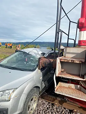 En personbil med fire personer i kolliderer med tog på overgangen. Personer i bilen er LKAB ansatte. Kjøreledning faller ned og ligger over lokomotivet.